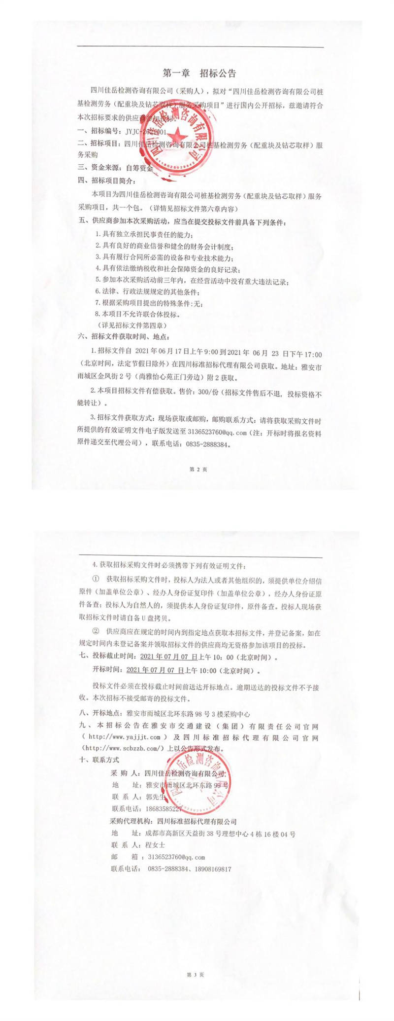 四川佳岳檢測咨詢有限公司樁基檢測勞務(配重塊及鉆芯取樣)服務采購招標公告