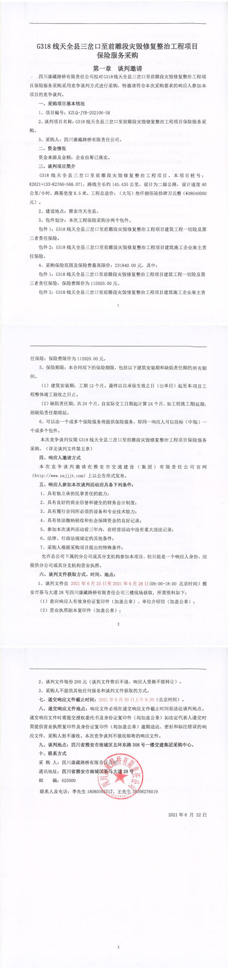 四川康藏路橋有限責(zé)任公司G318線天全縣三岔口至前雕段災(zāi)毀修復(fù)整治工程項目保險服務(wù)采購競爭談判公告