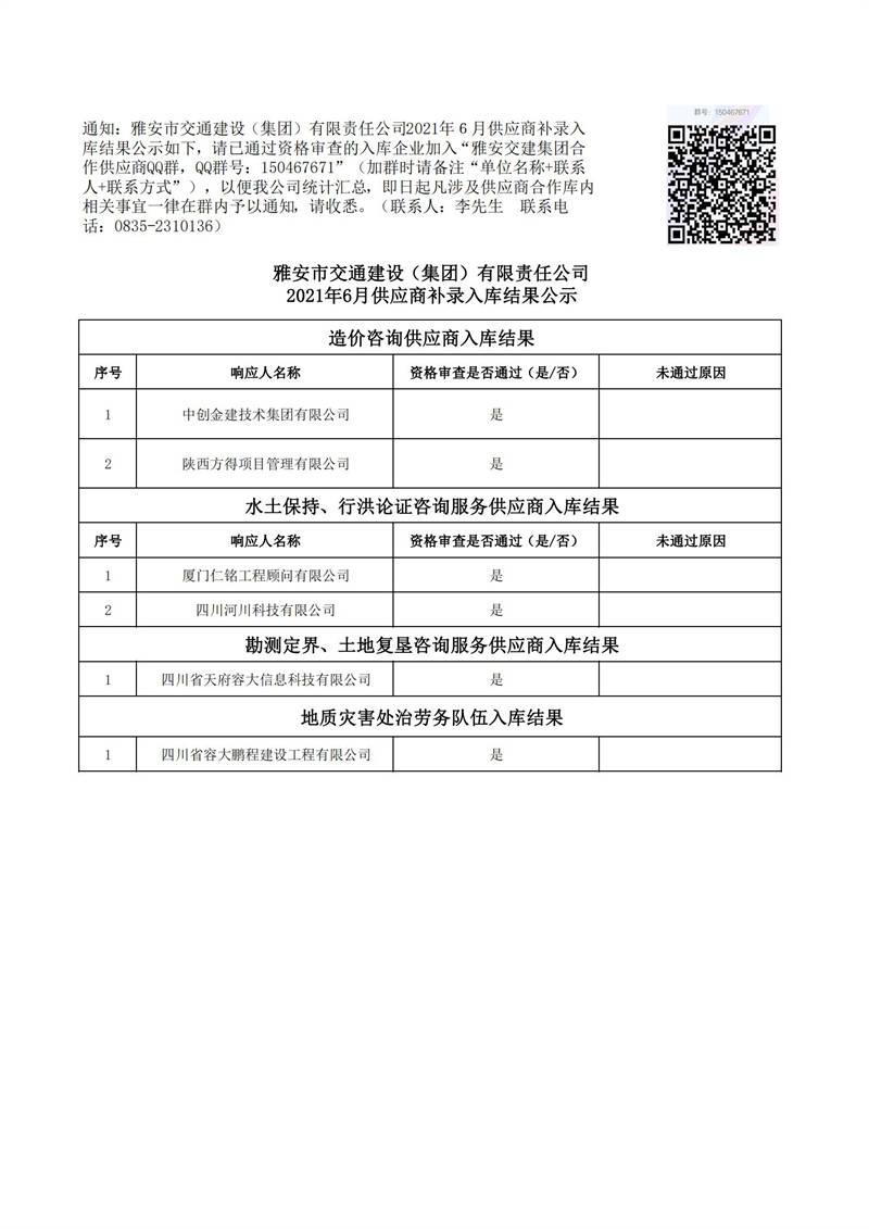 雅安市交通建設(shè)(集團(tuán))有限責(zé)任公司2021年6月供應(yīng)商補(bǔ)錄入庫(kù)結(jié)果公示