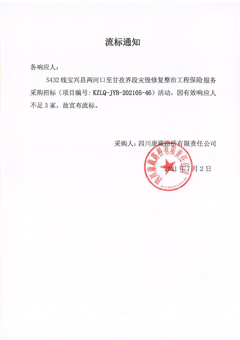 四川康藏路橋有限責任公司S432線寶興縣兩河口至甘孜界段災(zāi)毀修復(fù)整治工程保險服務(wù)采購流標通知