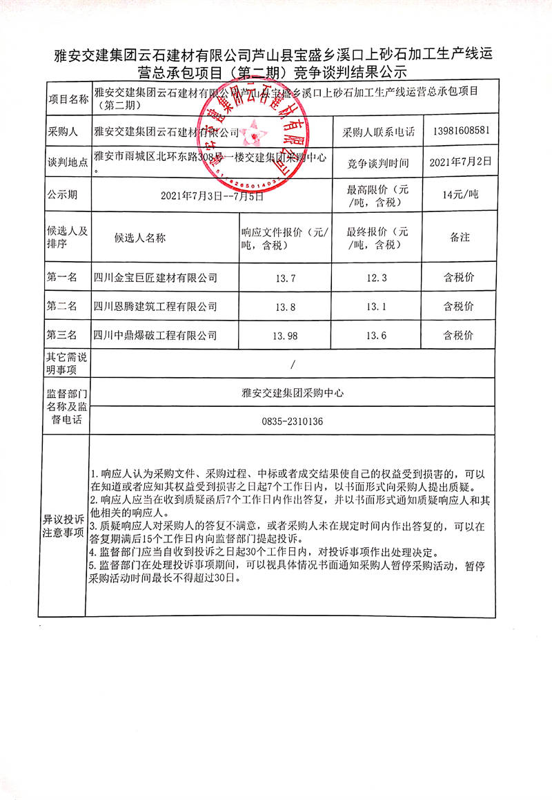 雅安交建集團(tuán)云石建材有限公司蘆山縣寶盛鄉(xiāng)溪口上砂石加工生產(chǎn)線運營總承包項目(第二期)競爭談判結(jié)果公示