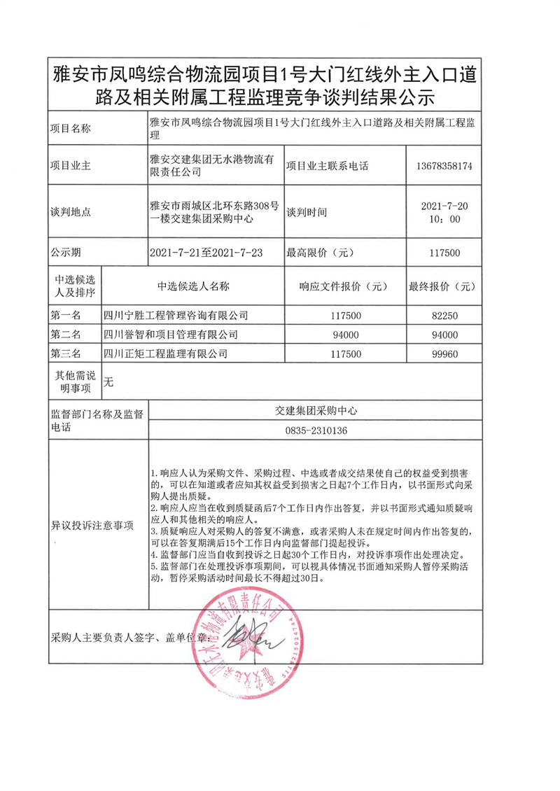 雅安交建集團(tuán)無(wú)水港物流有限責(zé)任公司雅安市鳳鳴綜合物流園項(xiàng)目1號(hào)大門(mén)紅線外主入口道路及相關(guān)附屬工程監(jiān)理競(jìng)爭(zhēng)談判結(jié)果公示