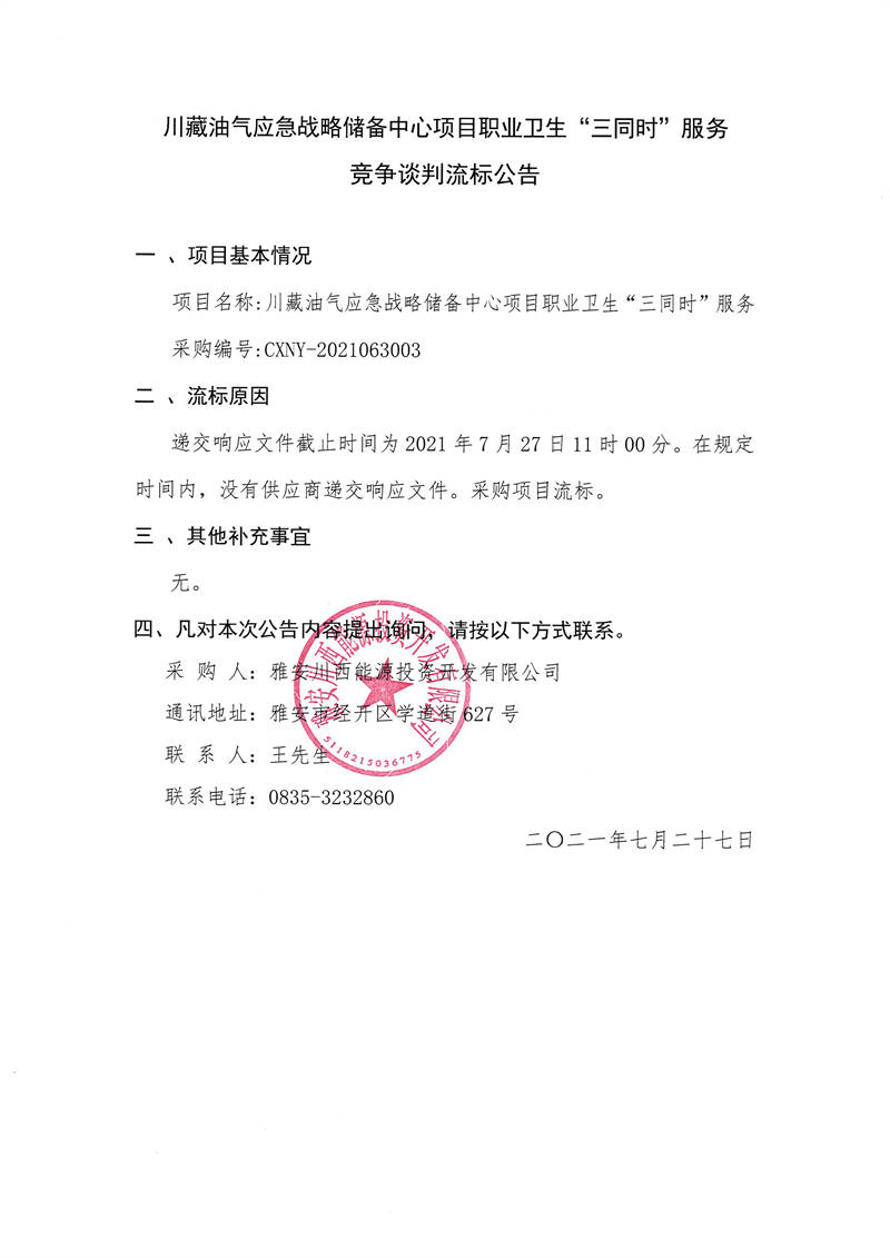 雅安川西能源投資開發(fā)有限公司川藏油氣應(yīng)急戰(zhàn)略儲備中心項目職業(yè)衛(wèi)生“三同時”服務(wù)競爭談判流標(biāo)公告