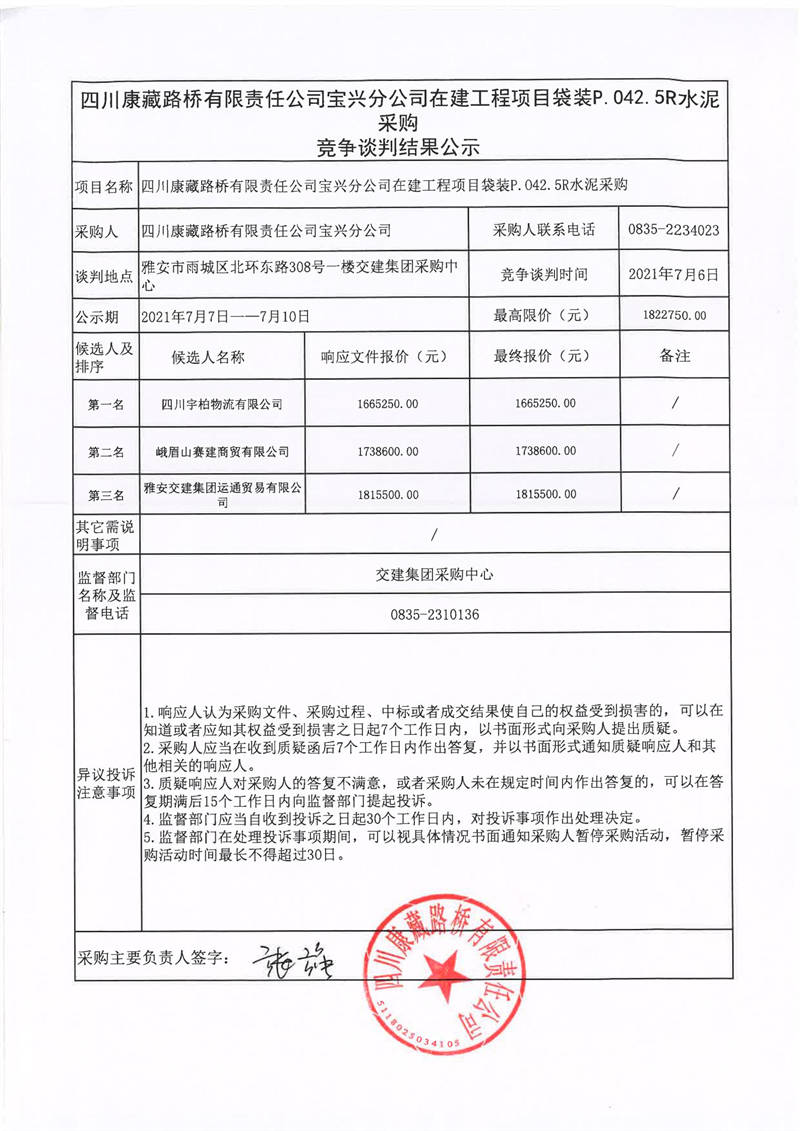 四川康藏路橋有限責任公司寶興分公司在建工程項目袋裝P.042.5R水泥采購競爭談判結(jié)果公示