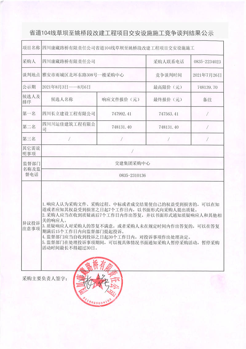 四川康藏路橋有限責(zé)任公司省道104線草壩至姚橋段改建工程項(xiàng)目交安設(shè)施施工競(jìng)爭(zhēng)談判結(jié)果公示