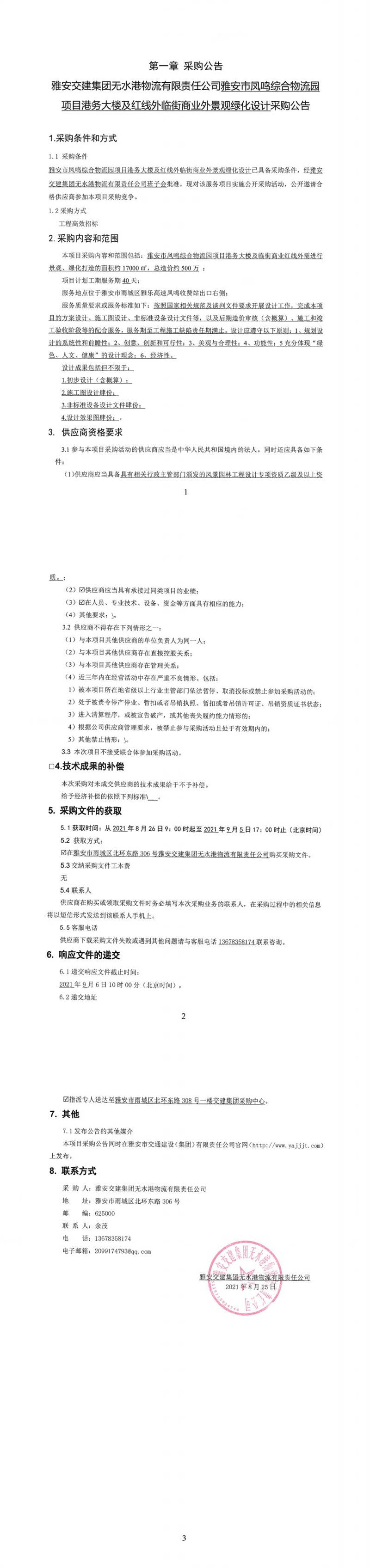 雅安交建集團(tuán)無水港物流有限責(zé)任公司雅安市鳳鳴綜合物流園項(xiàng)目港務(wù)大樓及紅線外臨街商業(yè)外景觀綠化設(shè)計(jì)采購(gòu)公告