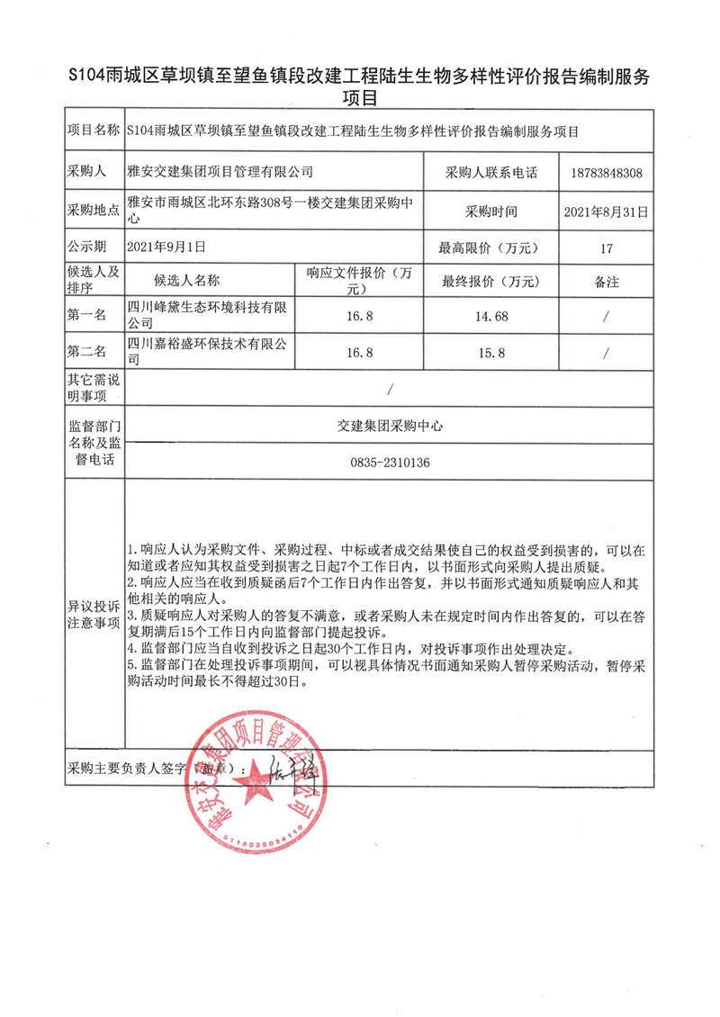 雅安交建集團(tuán)項目管理有限公司S104雨城區(qū)草壩鎮(zhèn)至望魚鎮(zhèn)段改建工程陸生生物多樣性評價報告編制服務(wù)項目評審結(jié)果公示