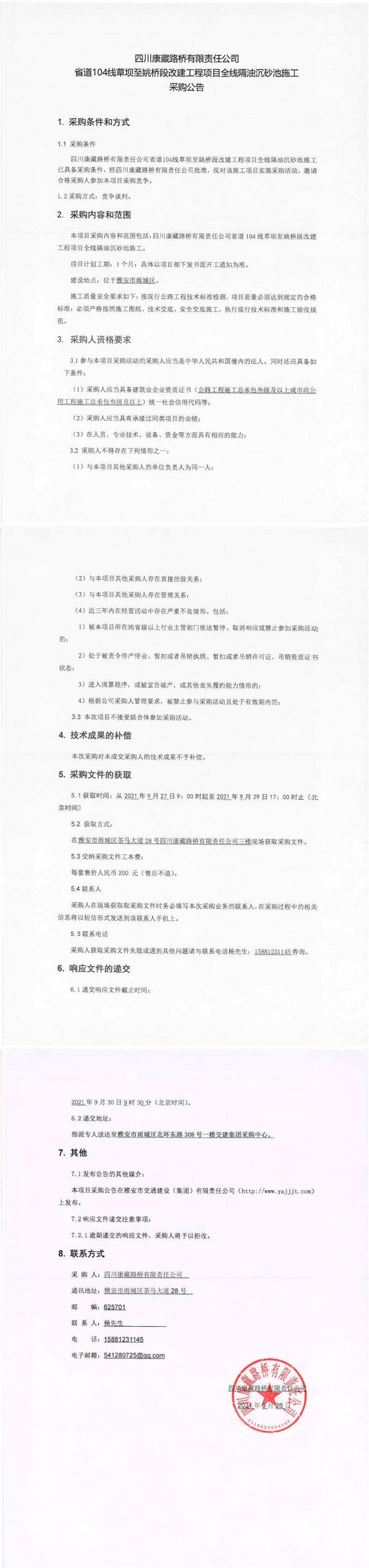 四川康藏路橋有限責(zé)任公司省道104線草壩至姚橋段改建工程項(xiàng)目全線隔油沉砂池施工采購(gòu)公告