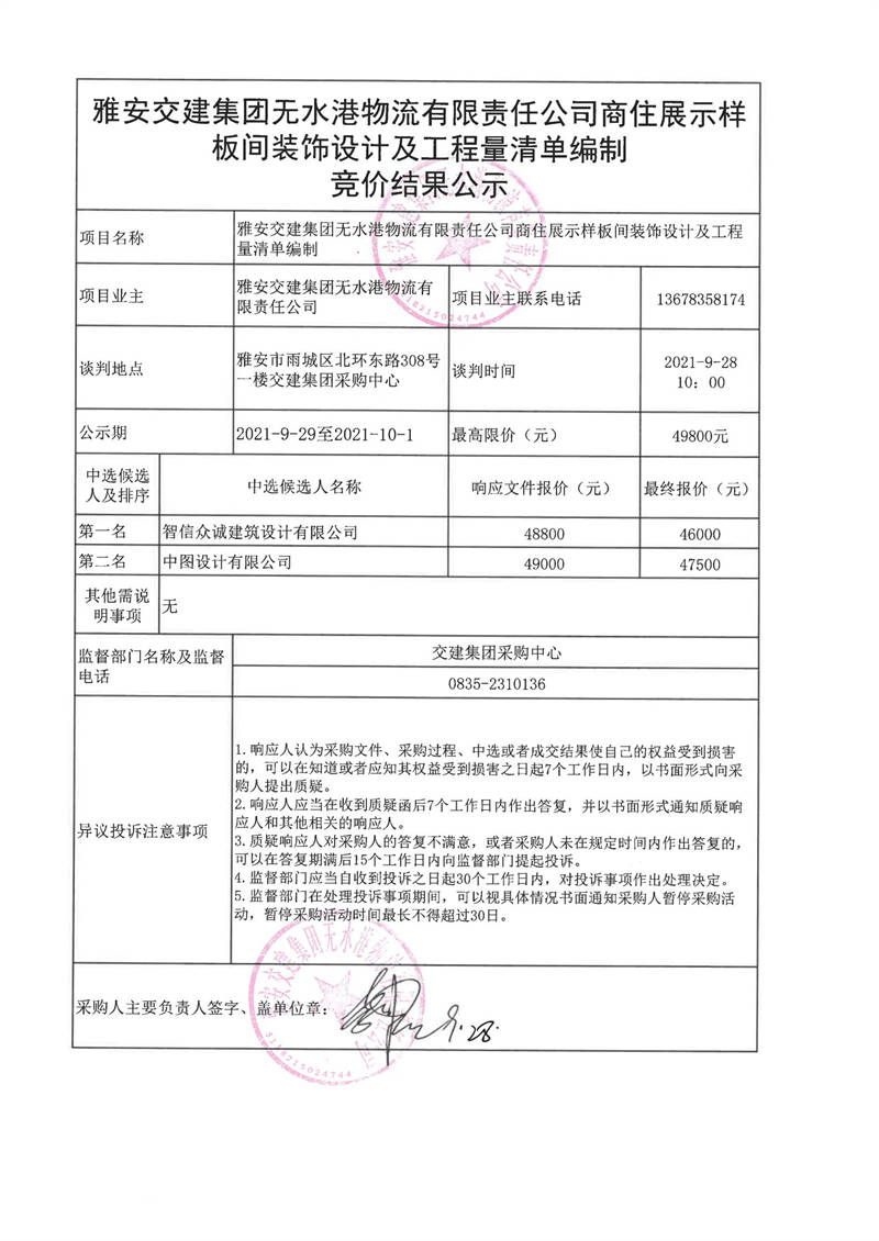 雅安交建集團無水港物流有限責(zé)任公司商住展示樣板間裝飾設(shè)計及工程量清單編制競價結(jié)果公示