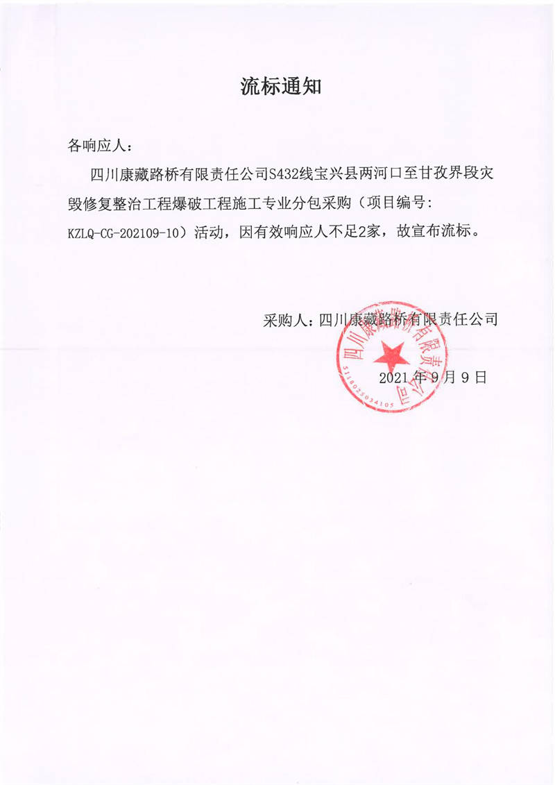 四川康藏路橋有限責任公司S432線寶興縣兩河口至甘孜界段災毀修復整治工程爆破工程施工專業(yè)分包采購流標通知