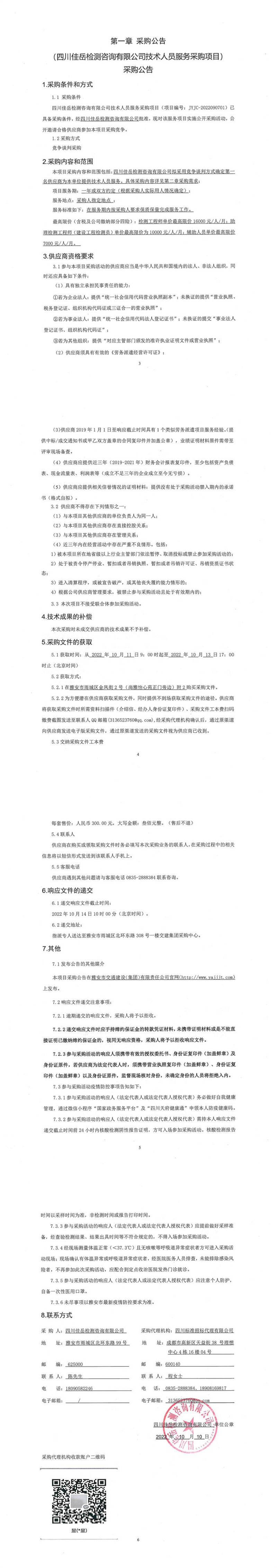 四川佳岳檢測咨詢有限公司技術人員服務采購項目采購公告