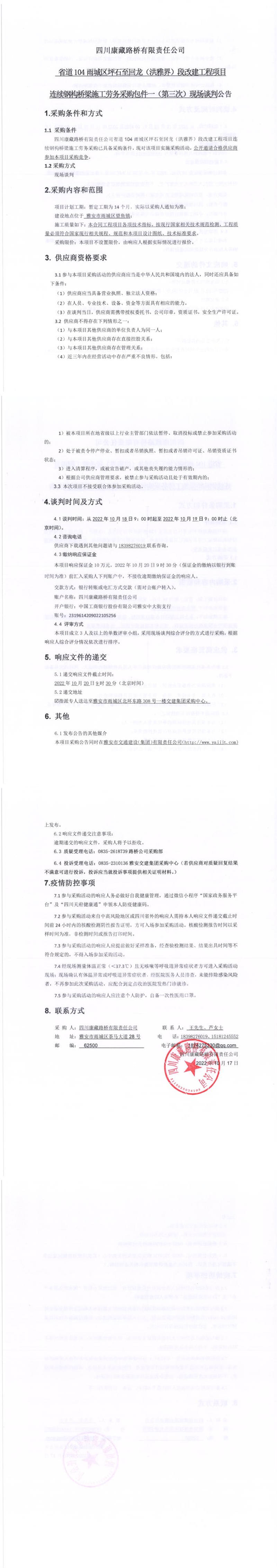 四川康藏路橋有限責任公司省道104雨城區(qū)坪石至回龍(洪雅界)段改建工程項目連續(xù)鋼構橋梁施工勞務采購包件一(第三次)現場談判公告
