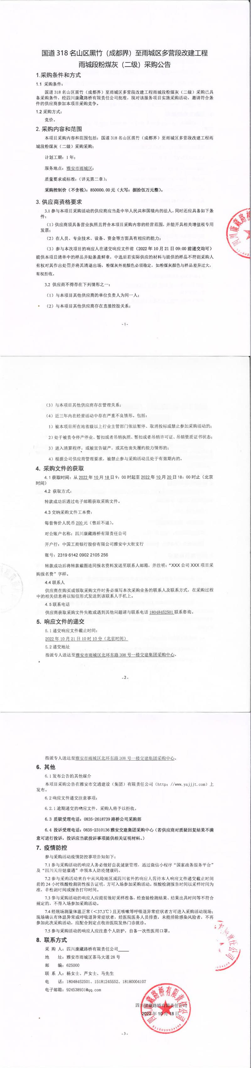 四川康藏路橋有限責(zé)任公司國(guó)道318名山區(qū)黑竹(成都界)至雨城區(qū)多營(yíng)段改建工程雨城段粉煤灰(二級(jí))采購公告