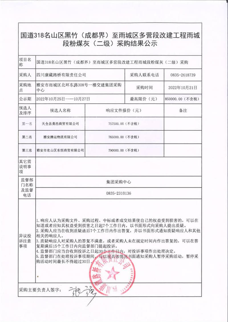 四川康藏路橋有限責(zé)任公司國(guó)道318名山區(qū)黑竹(成都界)至雨城區(qū)多營(yíng)段改建工程雨城段粉煤灰(二級(jí))采購(gòu)結(jié)果公示