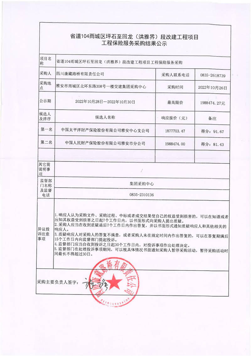 四川康藏路橋有限責(zé)任公司省道104雨城區(qū)坪石至回龍(洪雅界)段改建工程項(xiàng)目工程保險(xiǎn)服務(wù)采購(gòu)結(jié)果公示