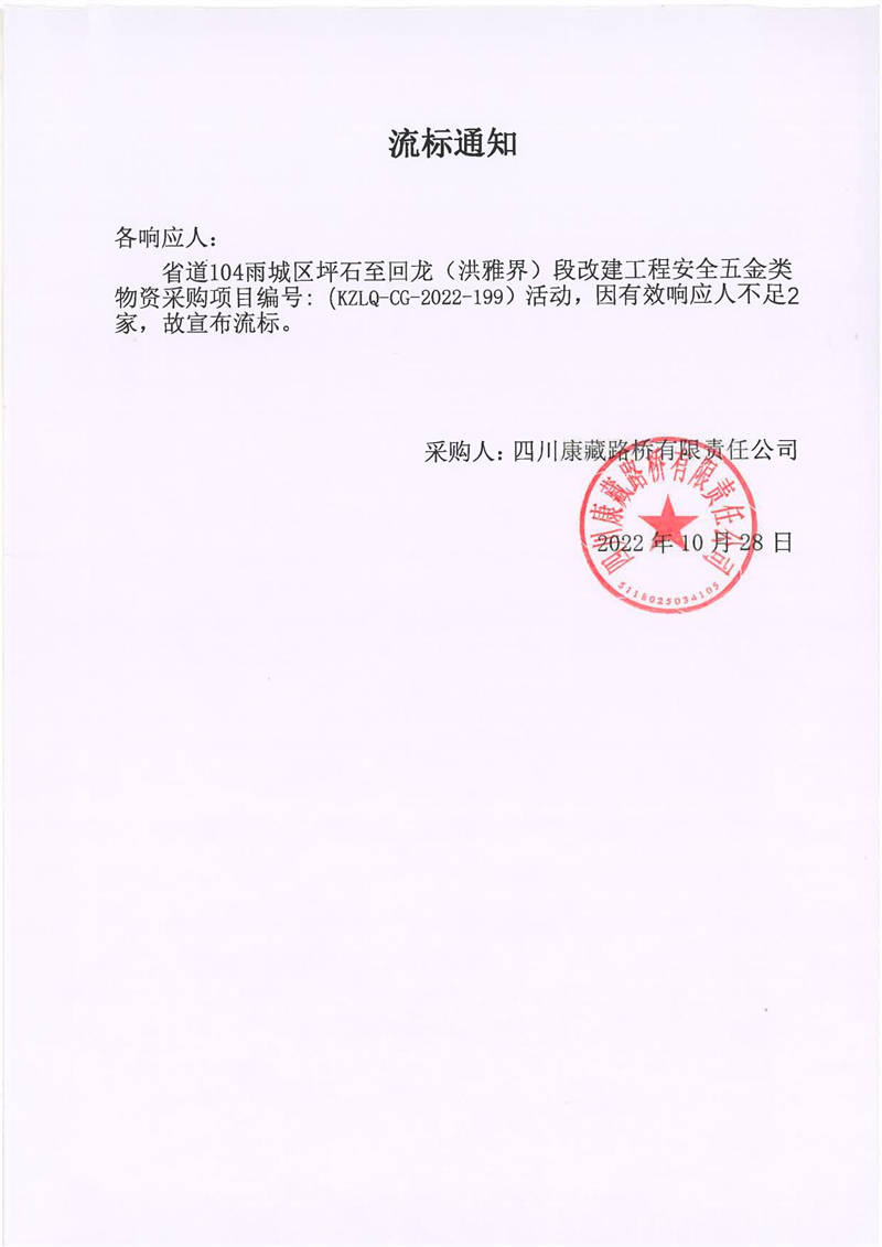 四川康藏路橋有限責任公司省道104雨城區(qū)坪石至回龍(洪雅界)段改建工程安全五金類物資采購項目流標通知