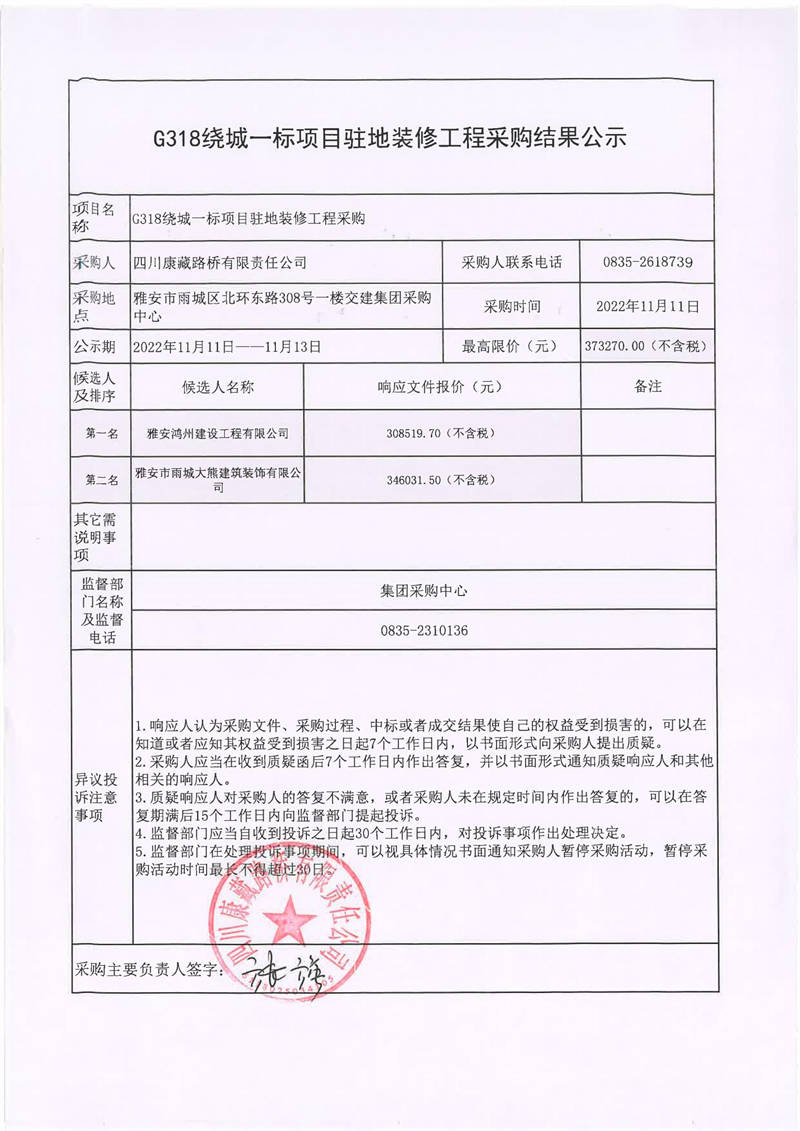 四川康藏路橋有限責(zé)任公司G318繞城一標(biāo)項目駐地裝修工程采購結(jié)果公示