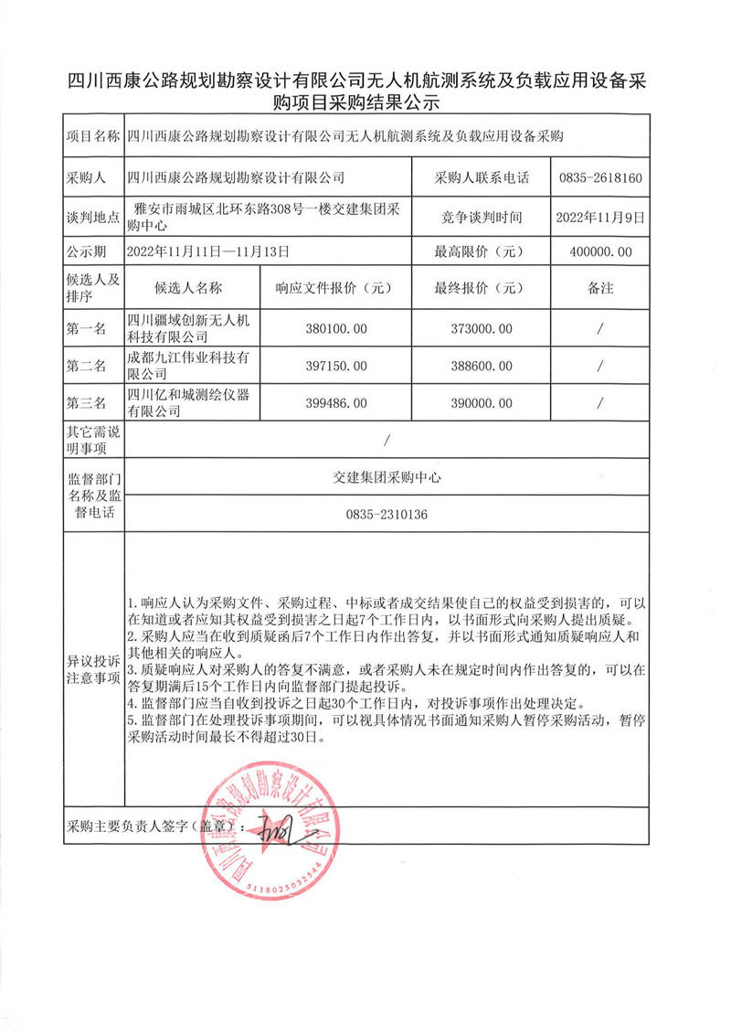 四川西康公路規(guī)劃勘察設(shè)計(jì)有限公司無人機(jī)航測(cè)系統(tǒng)及負(fù)載應(yīng)用設(shè)備采購(gòu)項(xiàng)目采購(gòu)結(jié)果公示
