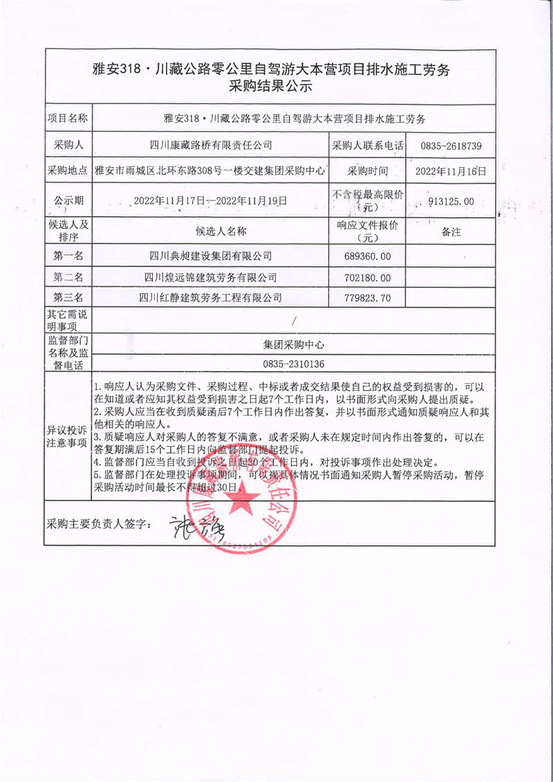 四川康藏路橋有限責(zé)任公司雅安318·川藏公路零公里自駕游大本營項目排水施工勞務(wù)采購結(jié)果公示