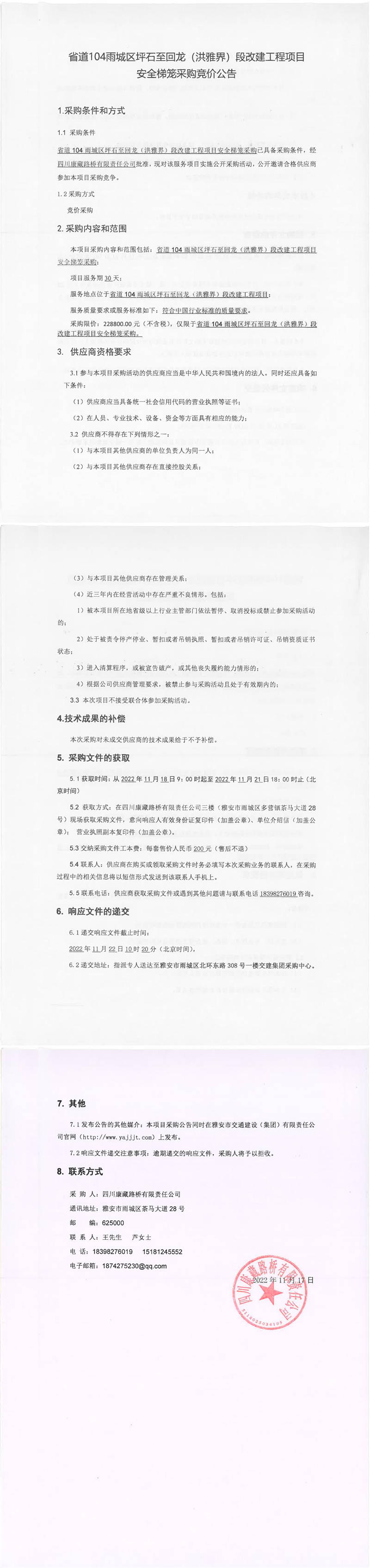 四川康藏路橋有限責(zé)任公司省道104雨城區(qū)坪石至回龍(洪雅界)段改建工程項(xiàng)目安全梯籠采購競(jìng)價(jià)公告