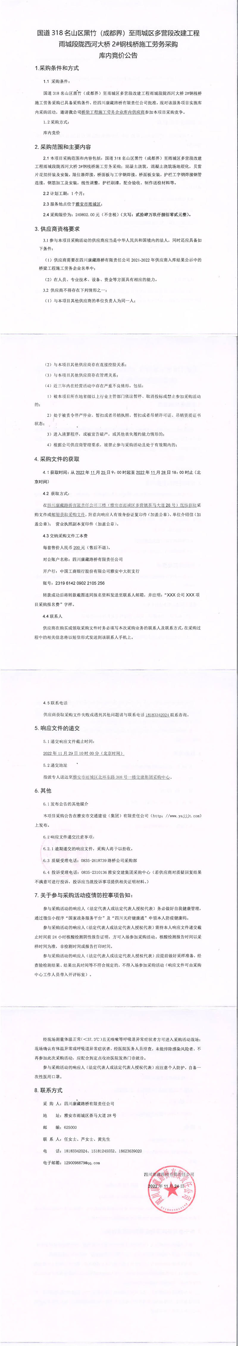 四川康藏路橋有限責任公司國道318名山區(qū)黑竹(成都界)至雨城區(qū)多營段改建工程雨城段隴西河大橋2#鋼棧橋施工勞務(wù)采購庫內(nèi)競價公告