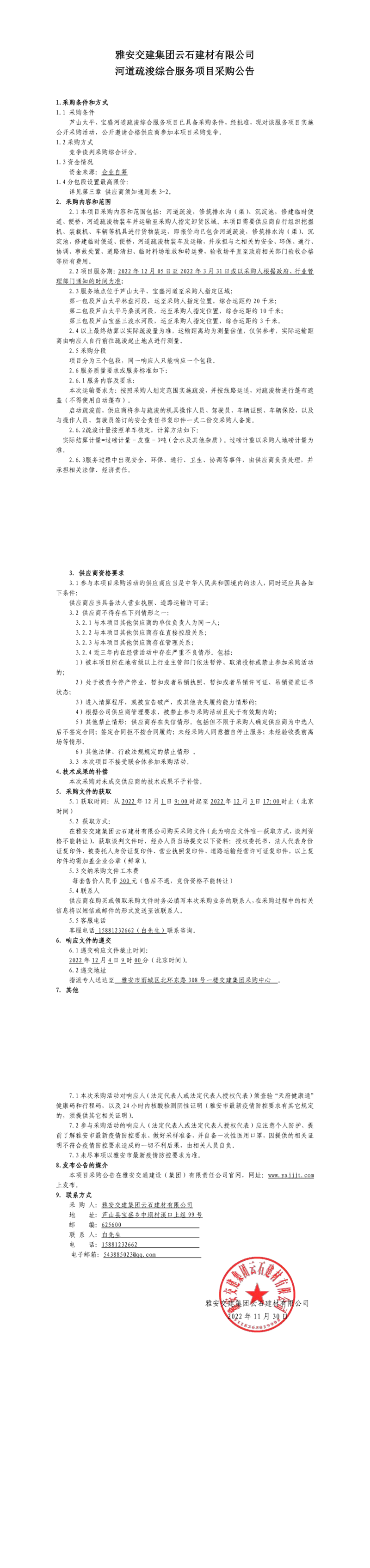 雅安交建集團(tuán)云石建材有限公司河道疏浚綜合服務(wù)項(xiàng)目采購公告