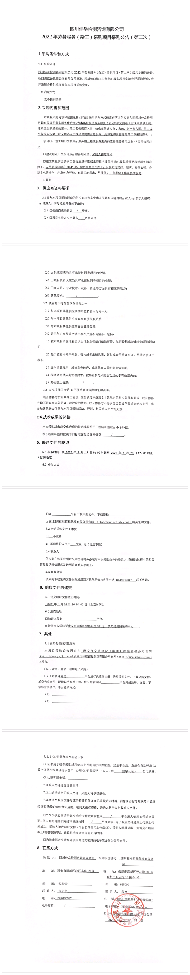 四川佳岳檢測(cè)咨詢有限公司2022年勞務(wù)服務(wù)(雜工)采購項(xiàng)目采購公告(第二次)