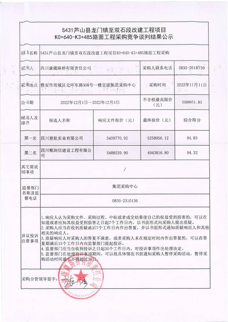 四川康藏路橋有限責任公司S431蘆山縣龍門鎮(zhèn)至雙石段改建工程項目K0+640-K3+485路面工程采購競爭談判結(jié)果公示