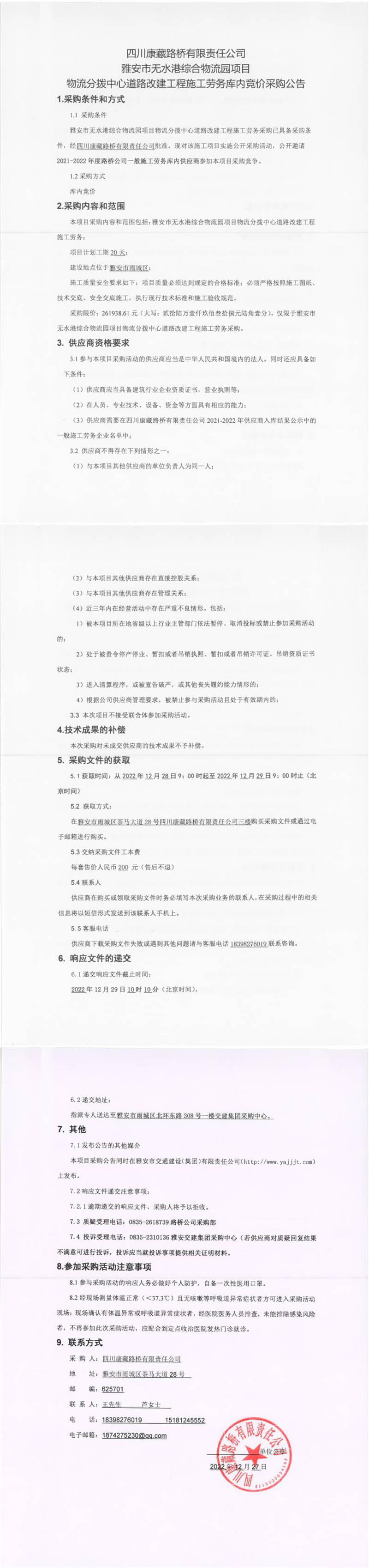 四川康藏路橋有限責(zé)任公司雅安市無水港綜合物流園項(xiàng)目物流分撥中心道路改建工程施工勞務(wù)庫內(nèi)競價(jià)采購公告