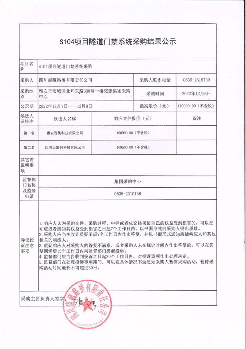四川康藏路橋有限責(zé)任公司S104項(xiàng)目隧道門禁系統(tǒng)采購(gòu)結(jié)果公示