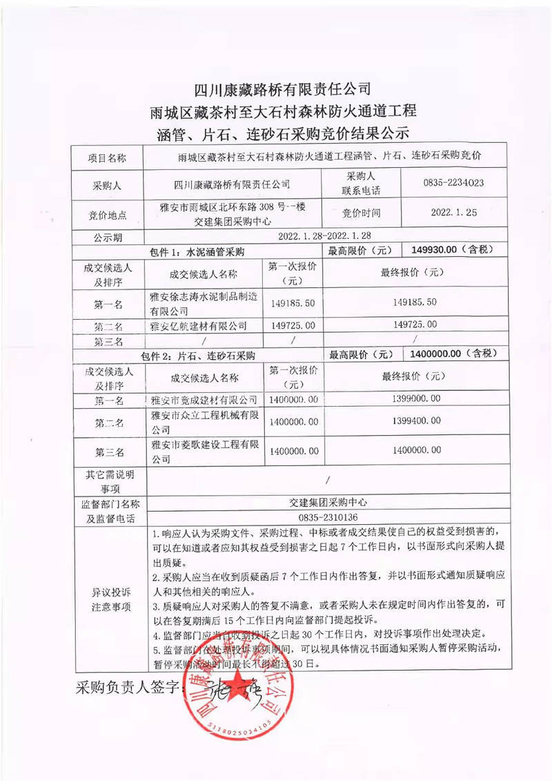 四川康藏路橋有限責任公司雨城區(qū)藏茶村至大石村森林防火通道工程涵管、片石、連砂石采購競價結果公示
