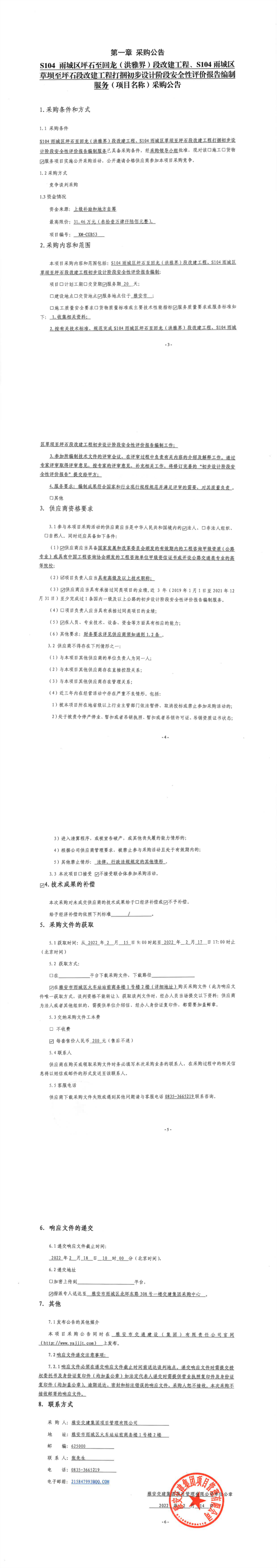 雅安交建集團(tuán)項(xiàng)目管理有限公司S104雨城區(qū)坪石至回龍(洪雅界)段改建工程、S104雨城區(qū)草壩至坪石段改建工程打捆初步設(shè)計(jì)階段安全性評(píng)價(jià)報(bào)告編制服務(wù)采購(gòu)公告