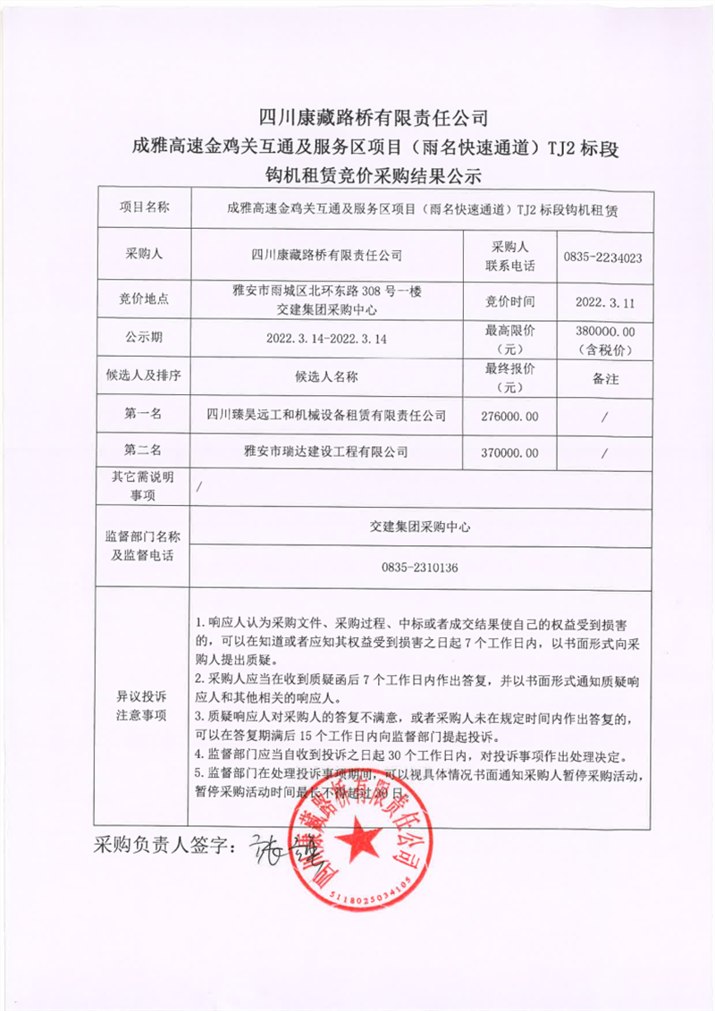 四川康藏路橋有限責(zé)任公司成雅高速金雞關(guān)互通及服務(wù)區(qū)項(xiàng)目(雨名快速通道)TJ2標(biāo)段鉤機(jī)租賃競價采購結(jié)果公示