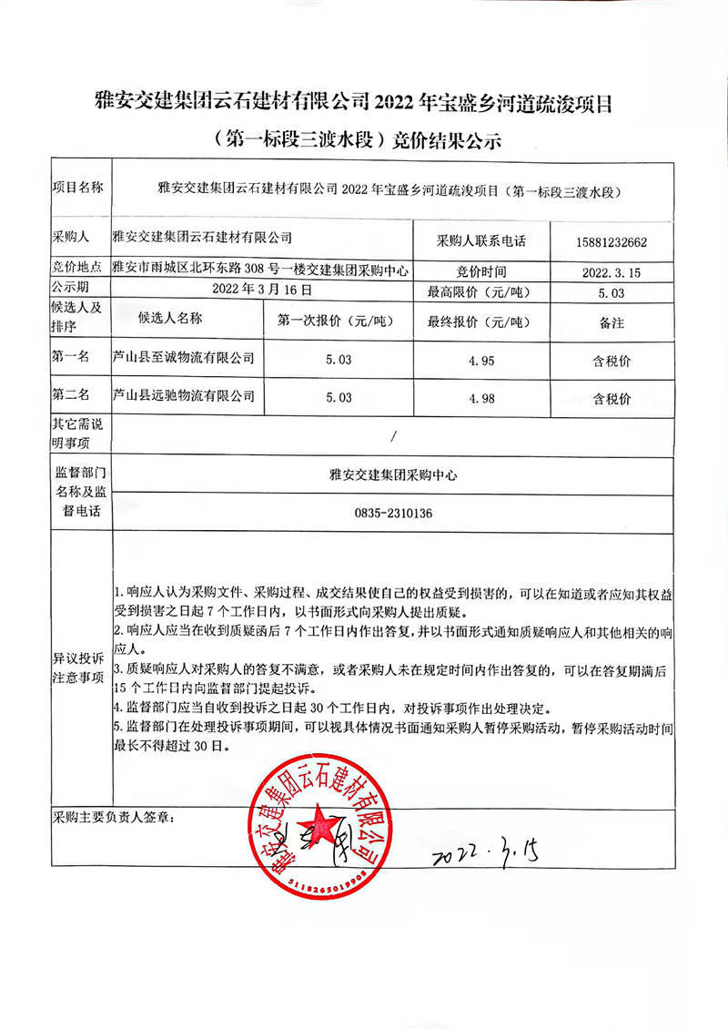 雅安交建集團云石建材有限公司2022年寶盛鄉(xiāng)河道疏浚項目(第一標段三渡水段)競價結(jié)果公示