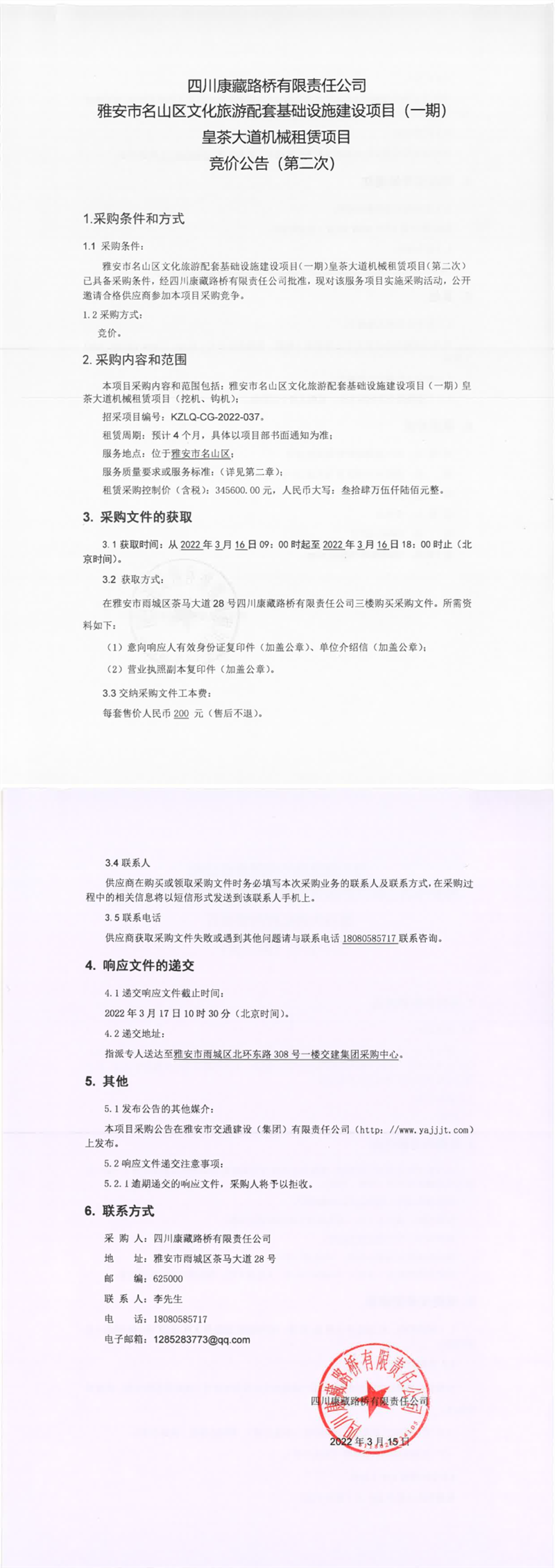 四川康藏路橋有限責(zé)任公司雅安市名山區(qū)文化旅游配套基礎(chǔ)設(shè)施建設(shè)項目(一期)皇茶大道機(jī)械租賃項目競價公告(第二次)