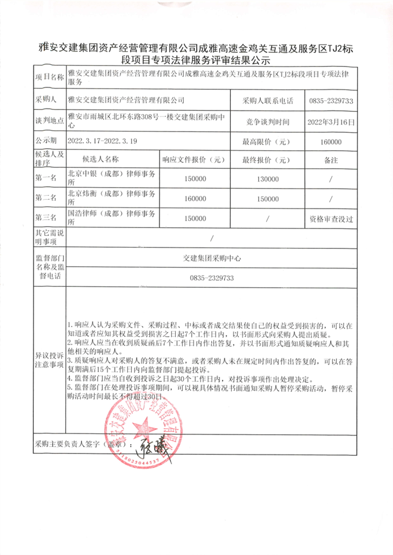 雅安交建集團資產(chǎn)經(jīng)營管理有限公司成雅高速金雞關互通及服務區(qū)TJ2標段項目專項法律服務評審結果公示