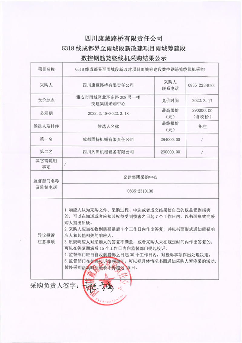 四川康藏路橋有限責(zé)任公司G318線成都界至雨城段新改建項(xiàng)目雨城籌建段數(shù)控鋼筋籠繞線機(jī)采購結(jié)果公示