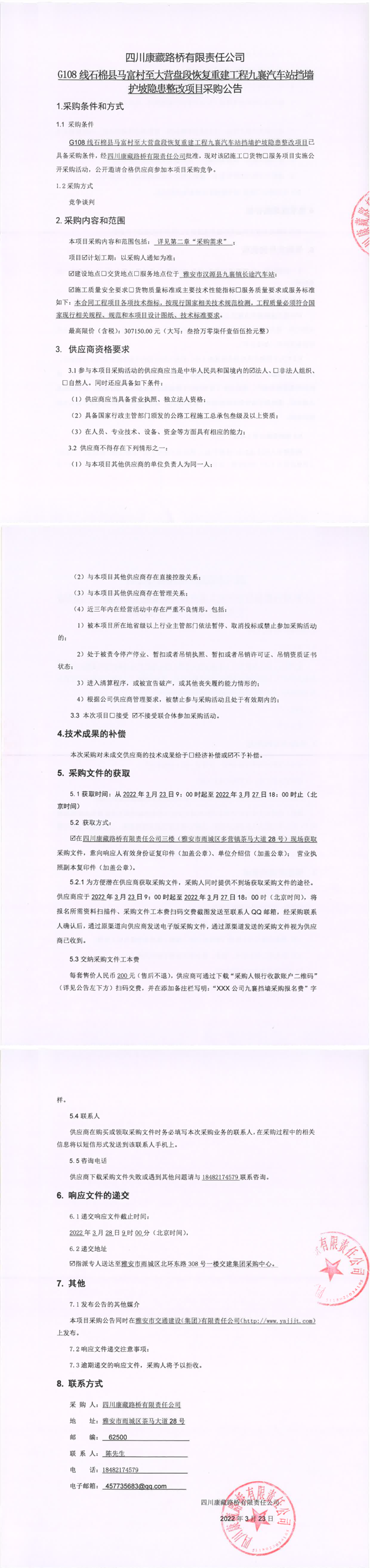 四川康藏路橋有限責(zé)任公司G108線石棉縣馬福村至大營盤段恢復(fù)重建工程九襄汽車站擋墻護(hù)坡隱患整改項目采購公告
