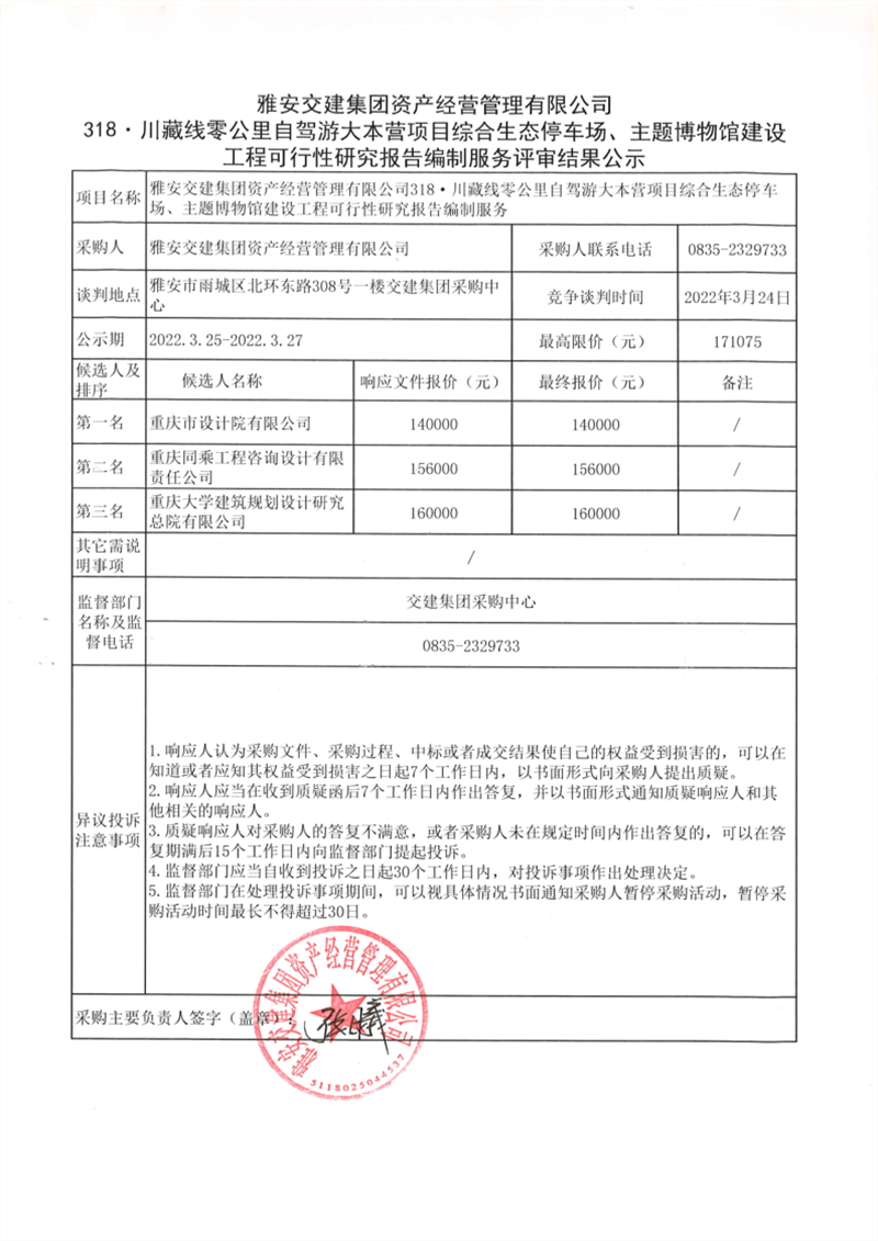 雅安交建集團(tuán)資產(chǎn)經(jīng)營(yíng)管理有限公司318.川藏線零公里自駕游大本營(yíng)項(xiàng)目綜合生態(tài)停車場(chǎng)、主題博物館建設(shè)工程可行性研究報(bào)告編制服務(wù)評(píng)審結(jié)果公示