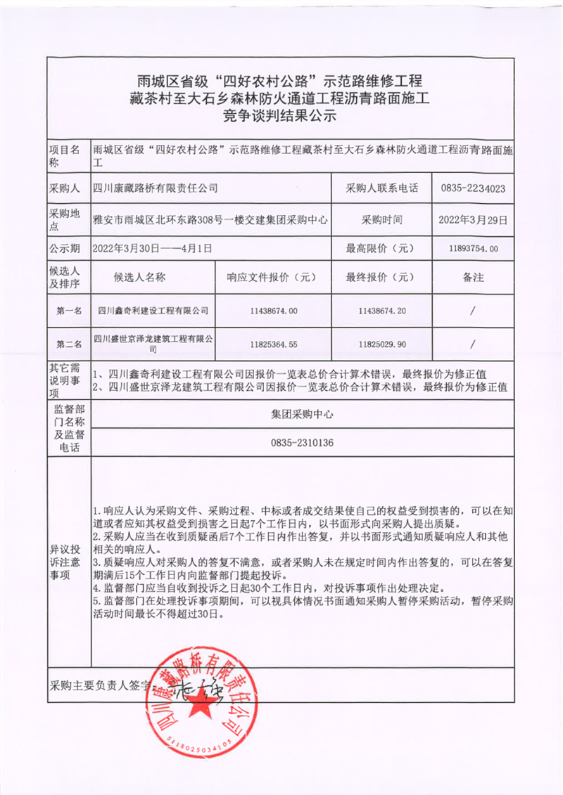 四川康藏路橋有限責(zé)任公司雨城區(qū)省級(jí)“四好農(nóng)村公路”示范路維修工程藏茶村至大石鄉(xiāng)森林防火通道工程瀝青路面施工競爭談判結(jié)果公示