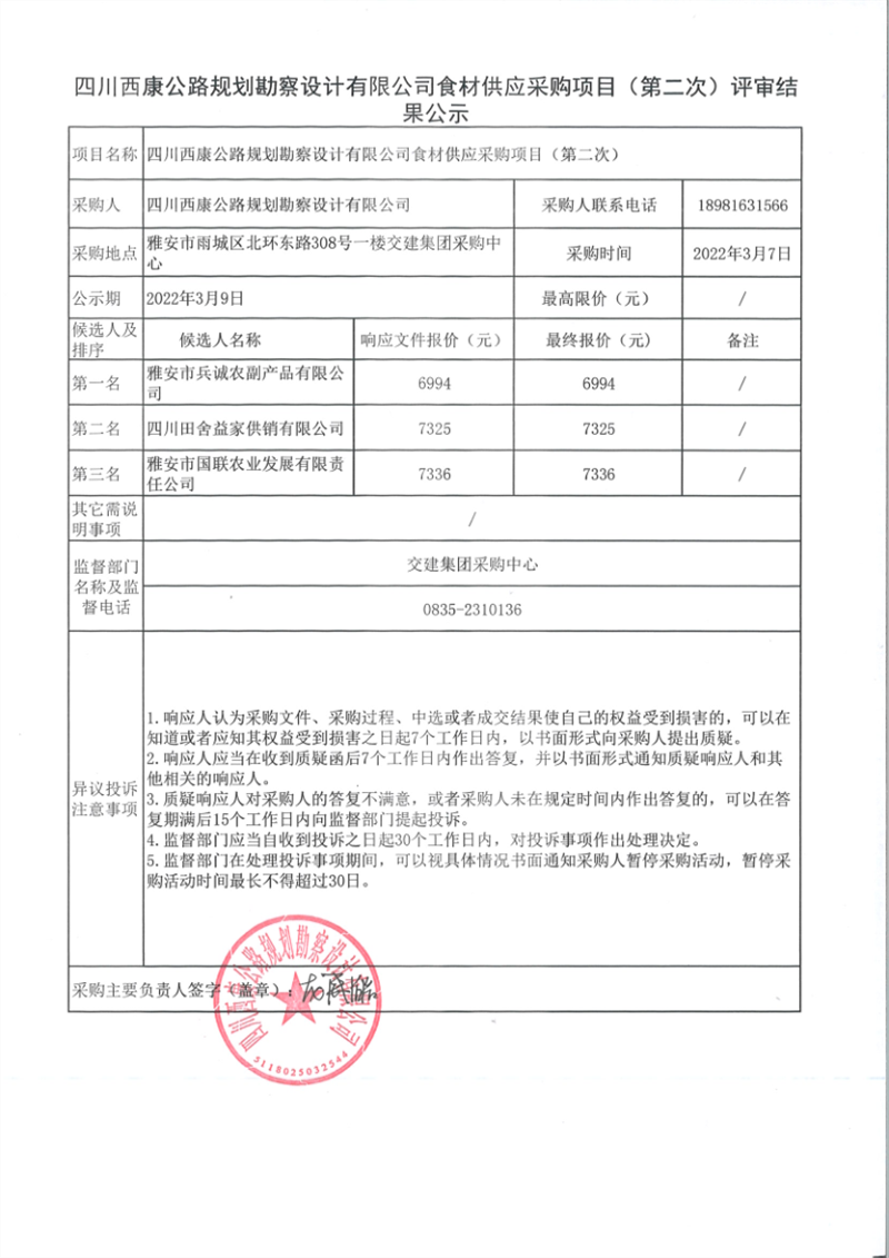 四川西康公路規(guī)劃勘察設(shè)計(jì)有限公司食材供應(yīng)采購(gòu)項(xiàng)目(第二次)評(píng)審結(jié)果公示