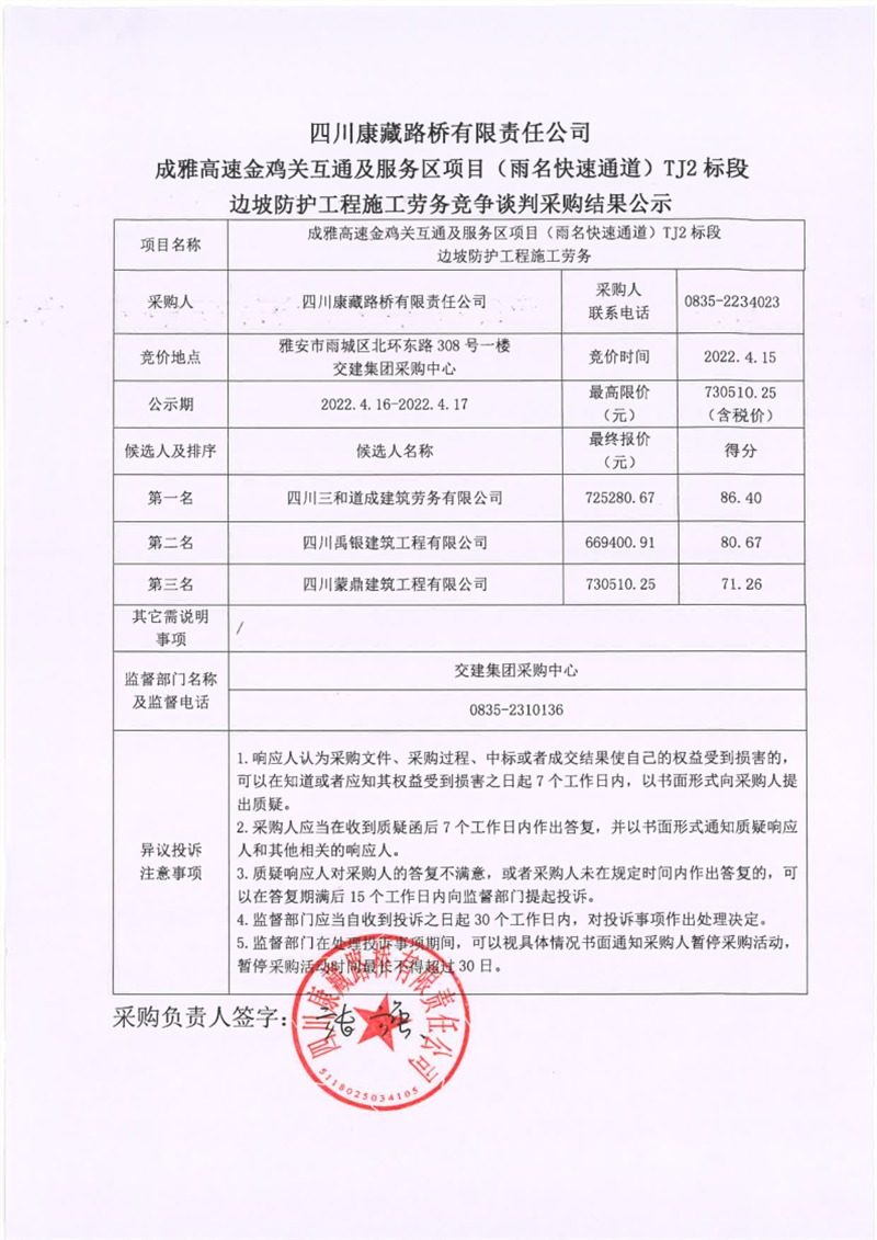 四川康藏路橋有限責(zé)任公司成雅高速金雞關(guān)互通及服務(wù)區(qū)項(xiàng)目(雨名快速通道)TJ2標(biāo)段邊坡防護(hù)工程施工勞務(wù)競(jìng)爭(zhēng)談判采購(gòu)結(jié)果公示