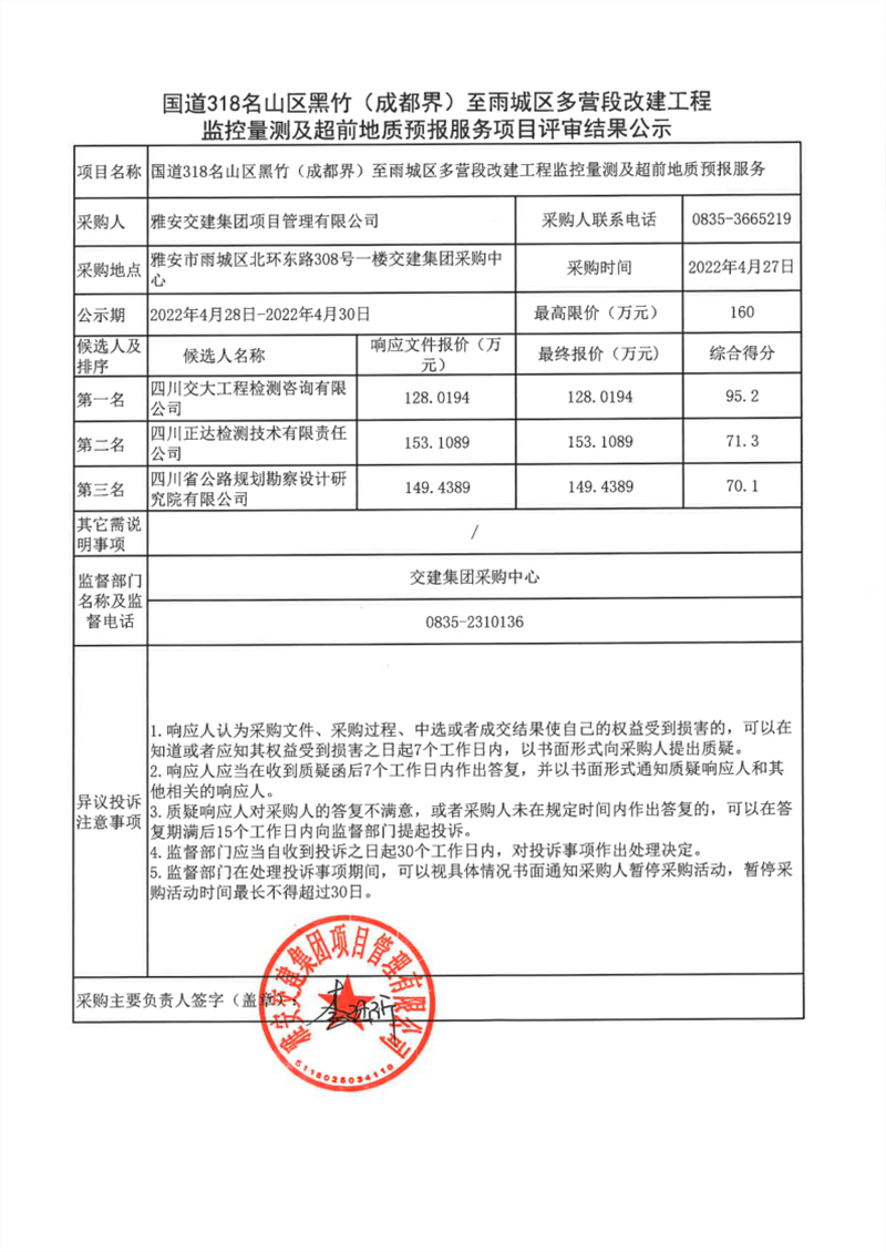 雅安交建集團項目管理有限公司國道318名山區(qū)黑竹(成都界)至雨城區(qū)多營段改建工程監(jiān)控量測及超前地質(zhì)預報服務(wù)項目評審結(jié)果公示
