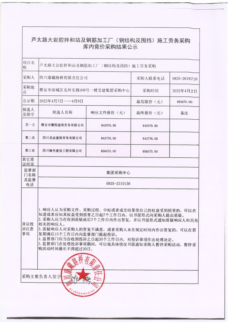 四川康藏路橋有限責(zé)任公司蘆太路大巖腔拌和站及鋼筋加工廠(鋼結(jié)構(gòu)及圍檔)施工勞務(wù)采購庫內(nèi)競(jìng)價(jià)采購結(jié)果公示