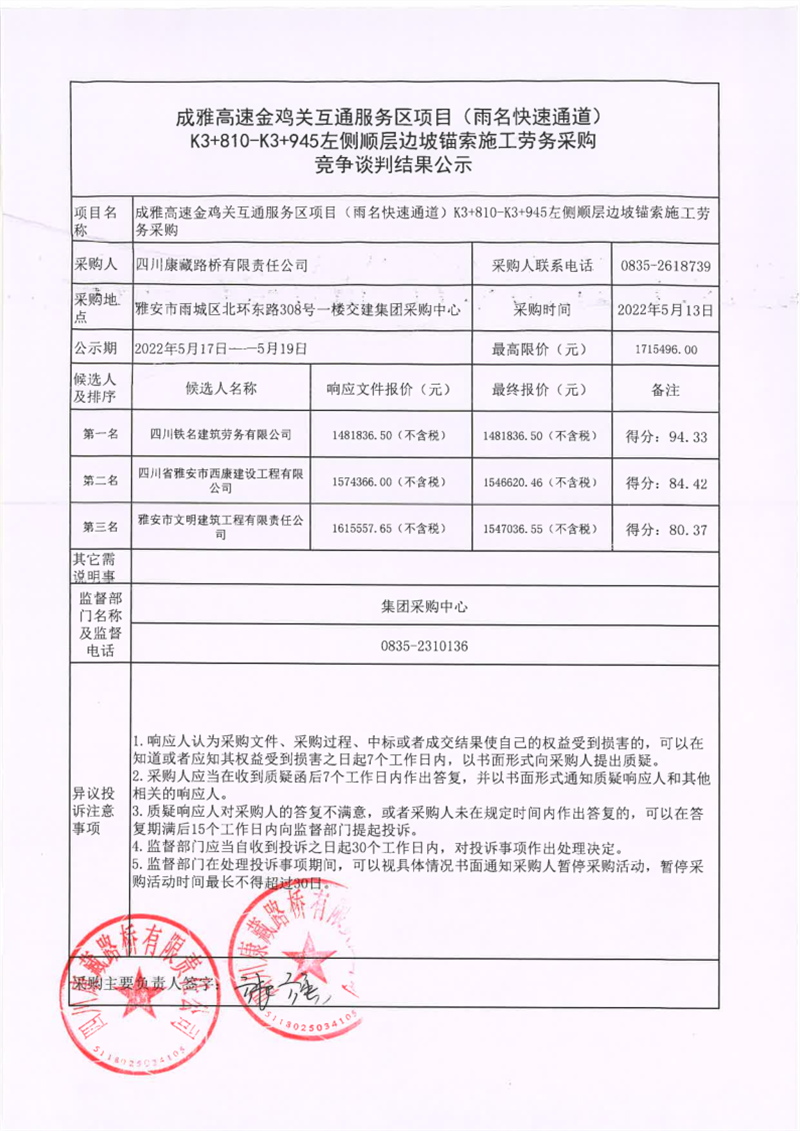 四川康藏路橋有限責任公司成雅高速金雞關互通服務區(qū)項目(雨名快速通道)K3+810-K3+945左側順層邊坡錨索施工勞務采購競爭談判結果公示