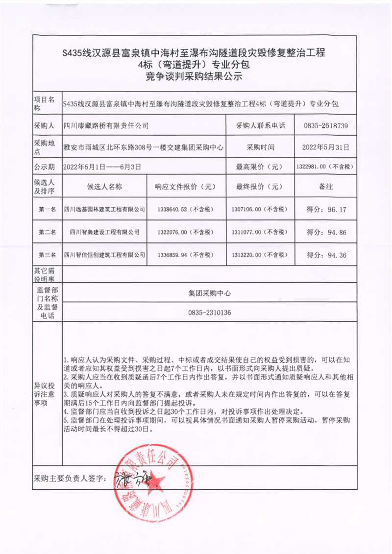 四川康藏路橋有限責(zé)任公司S435線(xiàn)漢源縣富泉鎮(zhèn)中海村至瀑布溝隧道段災(zāi)毀修復(fù)整治工程4標(biāo)(彎道提升)專(zhuān)業(yè)分包競(jìng)爭(zhēng)談判采購(gòu)結(jié)果公示