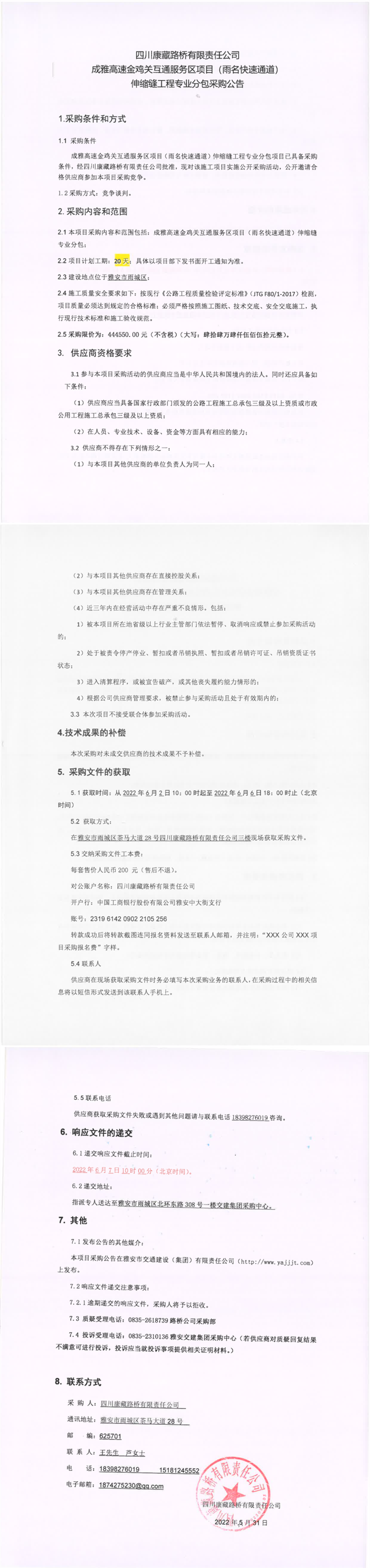 四川康藏路橋有限責(zé)任公司成雅高速金雞關(guān)互通服務(wù)區(qū)項(xiàng)目(雨名快速通道)伸縮縫工程專業(yè)分包采購(gòu)公告