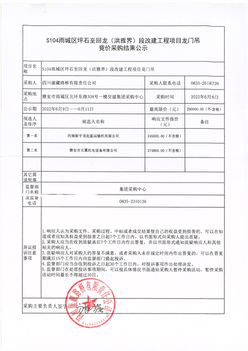 四川康藏路橋有限責(zé)任公司S104雨城區(qū)坪石至回龍(洪雅界)段改建工程項(xiàng)目龍門(mén)吊競(jìng)價(jià)采購(gòu)結(jié)果公示