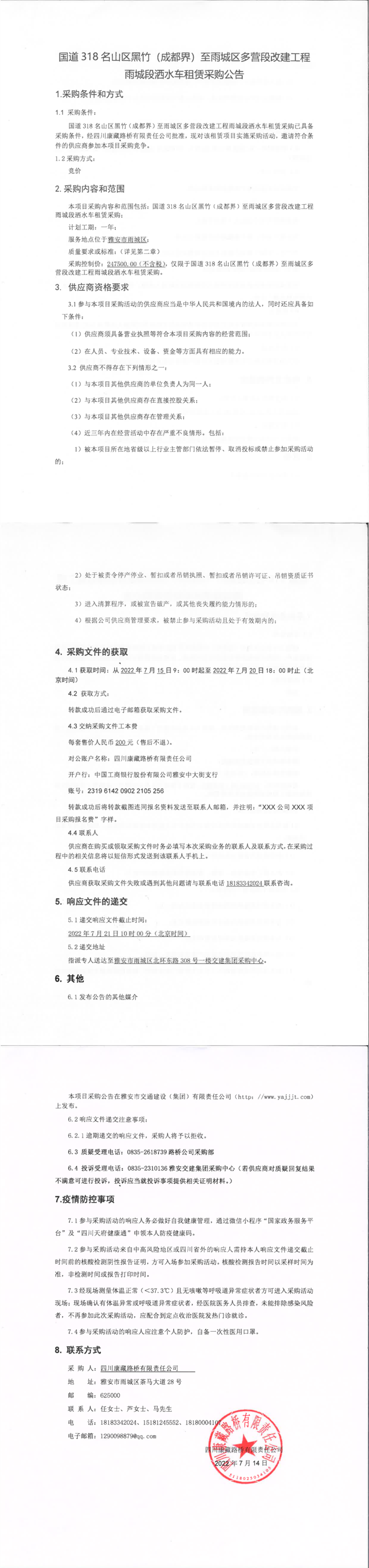 四川康藏路橋有限責(zé)任公司國道318名山區(qū)黑竹(成都界)至雨城區(qū)多營段改建工程雨城段灑水車租賃采購公告