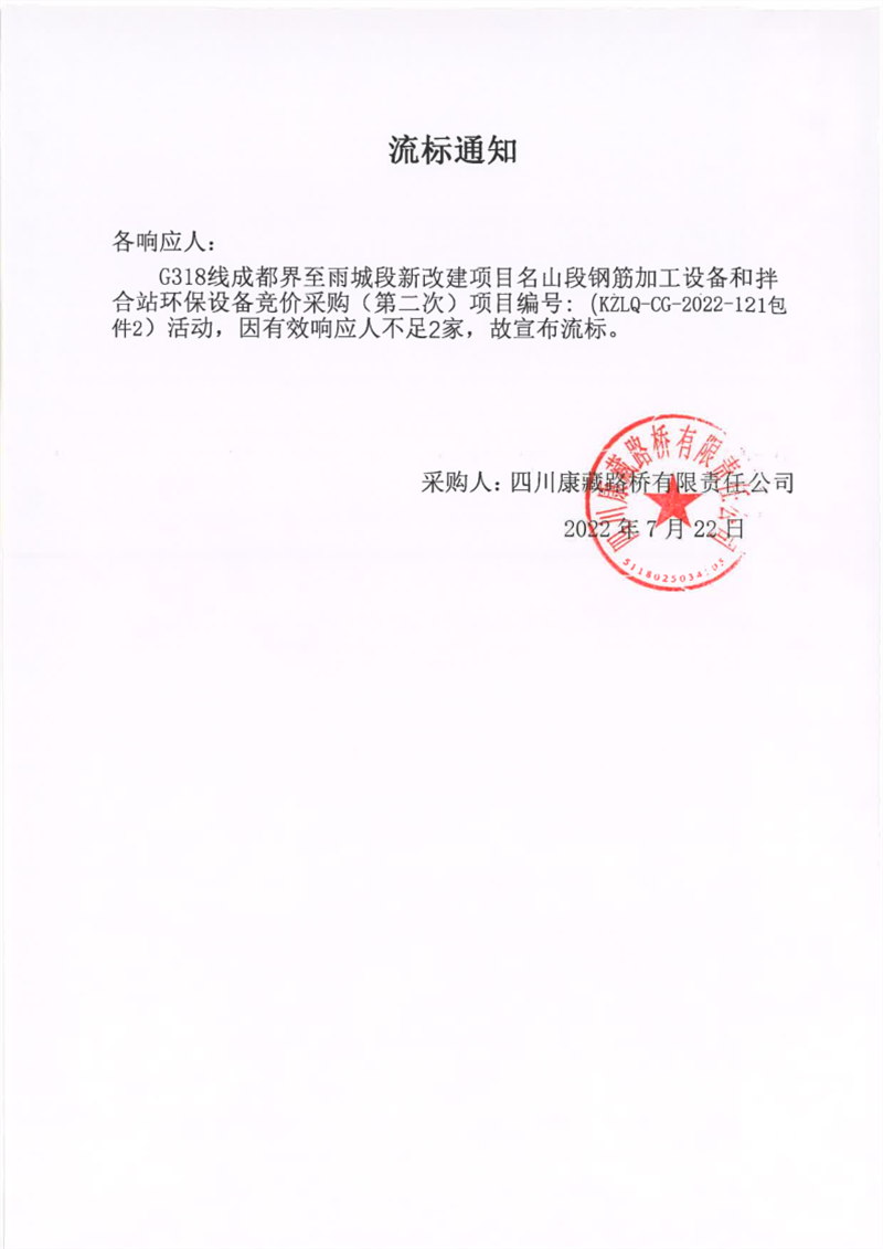 四川康藏路橋有限責(zé)任公司G318線成都界至雨城段新改建項(xiàng)目名山段鋼筋加工設(shè)備和拌合站環(huán)保設(shè)備競(jìng)價(jià)采購(第二次)包件2流標(biāo)通知